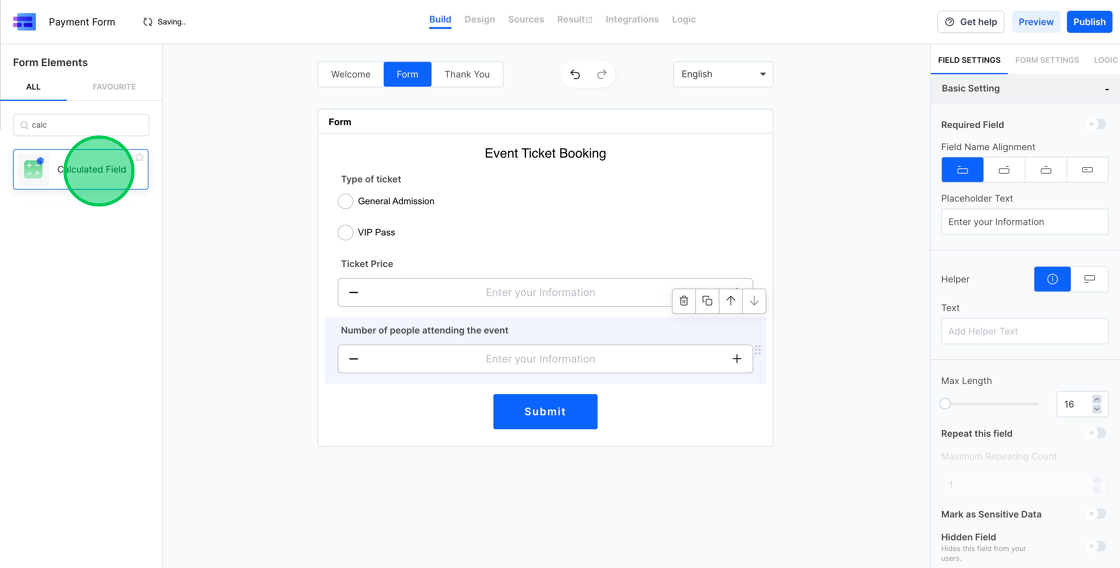 4. Within the settings for the calculated field, use the “Calculation Builder” to determine the final checkout amount by multiplying the ticket price by the number of tickets selected.
