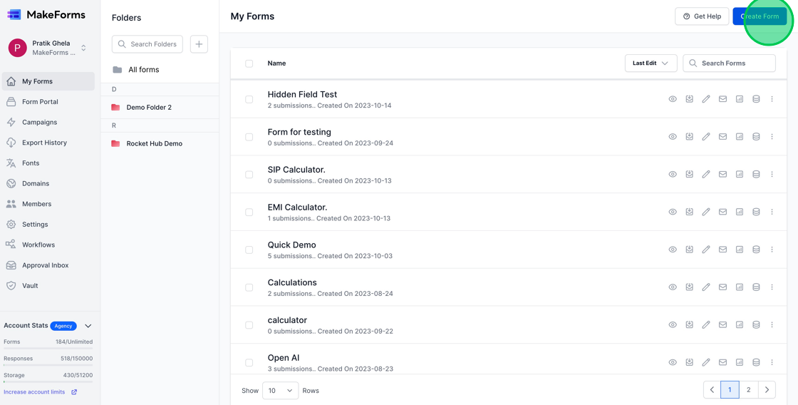 Begin by pressing the “Create Form” button. If you need guidance on constructing your initial form, consult the support documentation at https://makeforms.io/docs/creating-our-first-form/