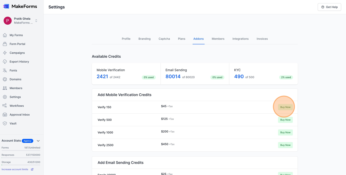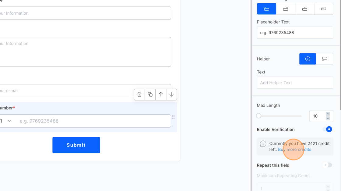 4. To activate mobile number verification, ensure you have sufficient verification credits. Once you turn on verification for your phone number, your current credit balance will be displayed. If you anticipate more submissions than the credits you have, click the “Buy more credits” button.