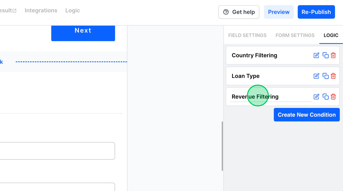 12. Next, we’ll work on setting up a condition that hides specific steps based on the type of loan the user is applying for. Remember, there’s no cap on the number of conditions you can configure. Navigate to “Logic” and you’ll observe the “Country Filtering” condition we previously established. To create a new condition, simply click on the “Create New Condition” button.